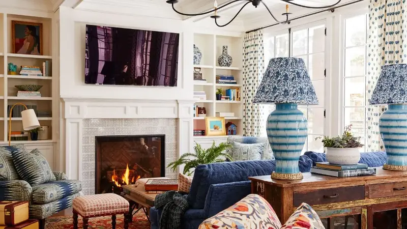Melissa Oholendt from Oho Interiors says, 'This room was wide in length but narrow in width, so we had enough space to create multiple flexible seating areas. It also had the plan challenge of a fireplace hearth that created space on both sides of the fireplace. Overall, we wanted one of those seating areas to feel like the moment where our clients could curl up with a book on a cozy evening, and the space around the fireplace felt like a perfect opportunity for a custom piece and therefore a moment to really layer in our client's personal effects.'